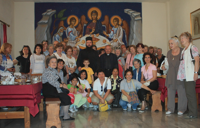 Der hl. Paulus ist auf seinem Weg von Athen nach Korinth in der Nähe des heutigen Klosters vorbeigekommen. Das berichtete uns Mönch Evlogios, der unsere Gruppe bei Kaffee und Gebäck empfing. Zum Dank für die Gastfreundschaft überreichte ihm unser Pfarrer eine offizielle Paulusmedaille des Paulusjahres 2008/2009 aus Rom. Seine Freude darüber zeigte Mönch Evlogios durch eine spontane mitbrüderliche Umarmung. Auf die Frage eines Kindes aus der Besuchergruppe erklärte er die ikonographische Darstellung der Hl. Dreifaltikeit an der Stirnseite des Empfangssaales. Erst auf Nachfrage stellte sich heraus, dass er selbst dieses Werk geschaffen hatte.
