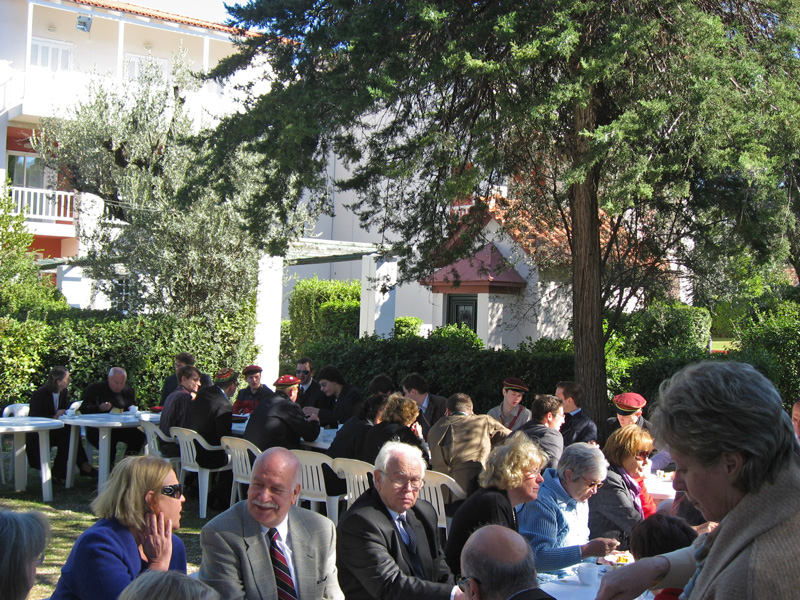 Am Samstag, dem 18. September, besuchten 37 Mitglieder und Freunde unserer Pfarrei in der Serie unserer Klosterbesuche das orthodoxe Frauenkloster I. M. EVANGELISTRIAS, im Bergland zwischen Theben und Livadia gelegen. Den schon einmal im Jahre 2002 erlebten monastischen Ort erreichten wir bei herrlichem Septemberwetter. Nach dem Singen des Sanctus in der alten Klosterkirche empfingen uns die Schwestern zum traditionellen Klosterkaffee mit wohlschmeckendem Gebäck. Anschließend sprach unser Pfarrer im Gästehaus des Klosters in Vertretung für den verhinderten Erzpriester Dimitrios Nikou über das Sanctus in der Feier der hl. Messe, jenen Augenblick, in dem sich der irdische mit dem himmlischen Gottesdienst verbindet. Nach dem Vortrag servierten uns die freundlichen Schwestern im Speisesaal des Gästehauses ein köstliches, aus Naturprodukten bereitetes Mittagessen. Nach einer Freizeit in der herrlichen Bergluft nahmen wir noch den Nachmittagskaffee mit von den Schwestern selbst gebackenem Kuchen ein. Am frühen Abend kehrten wir nach Athen zurück. |