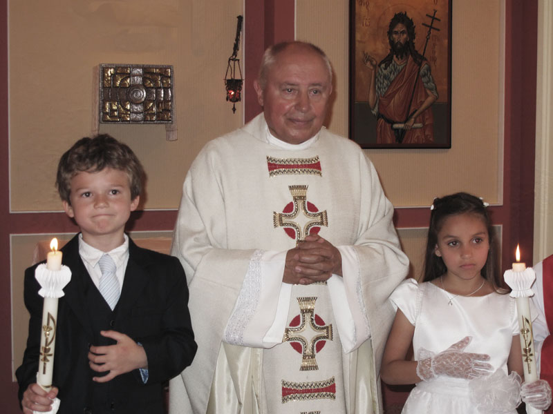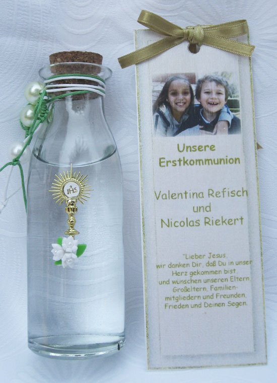 Am Sonntag, dem 29. Mai 2011 feierten wir bei herrlichem Wetter das Fest der Erstkommunion. Unsere Erstkommunikanten, Sarah Valentina Refisch und Nicolas David Riekert, hatten sich seit letztem Jahr auf diesen besonderen Tag mit unserem Pfarrer gründlich vorbereitet. Die festliche Messfeier vom 6. Sonntag der Osterzeit besuchten außer Mitgliedern und Freunden der Pfarrei zahlreich erschienene Angehörige der Erstkommunikanten, u. a. aus Venezuela und Peru. Nach dem Empfang der ersten hl. Kommunion sprach unser Pfarrer am Schluss der hl. Liturgie den Eltern der Erstkommunikanten ein herzliches Wort des Dankes aus. Er zeigte sich besonders erfreut über die regelmäßige Teilnahme beider Familien an der Sonntagsmesse sowie ihre regelmäßigen Fahrdienste zum freitäglichen Erstkommunionunterricht. Ohne diese Unterstützung der Eltern könne die Erstkommunionvorbereitung nicht gelingen. Des Weiteren dankte er für ihre großherzigen Geschenke anlässlich dieser Feier: den besonderen Blumenschmuck für die Muttergottes, die kunstvoll mit eucharistischen Symbolen bestickte Altardecke, die mit einer Monstranz geschmückten und mit Weihwasser gefüllten Fläschchen zur Tauferinnerung für alle Festteilnehmer. Für den anschließenden Buffetempfang hatten die Eltern alle Tische in den Kirchenfarben und mit schönen Blumen dekoriert und auch für Speisen und Getränke bestens gesorgt. Mit der Feier der hl. Messe am nächsten Tag dankten alle miteinander dem Herrn für dieses schöne Fest. |