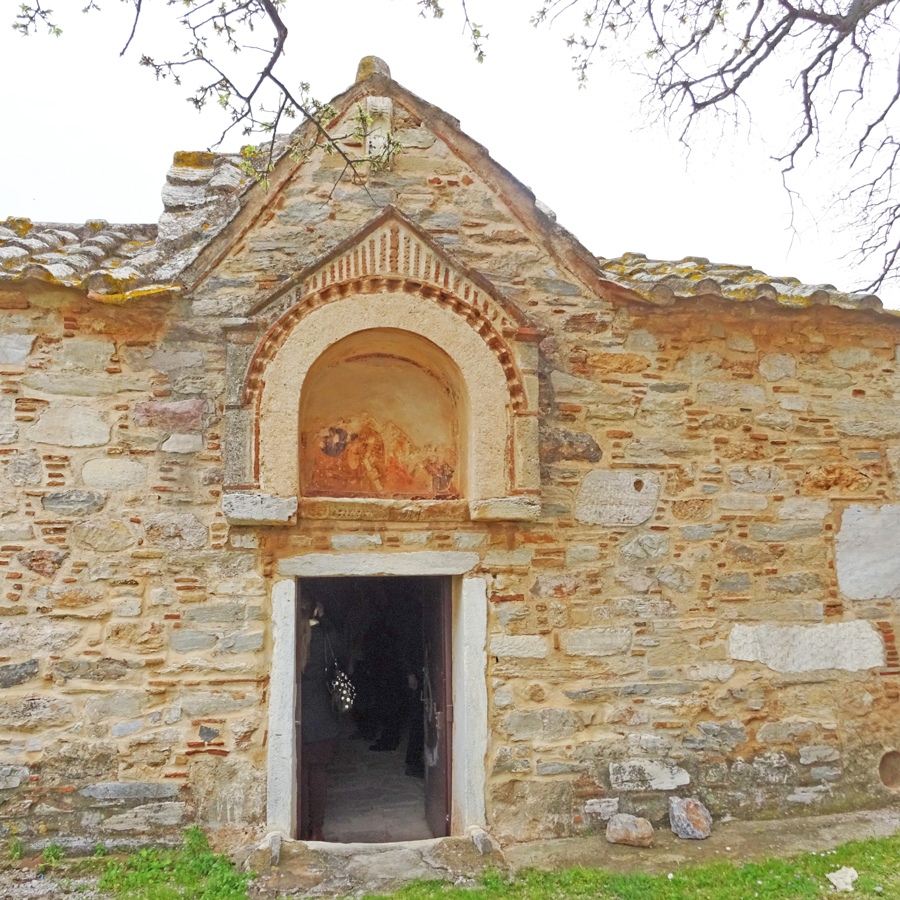 Die Kirche „Agios Petros“ ist eine kleine, sehr schöne kreuzförmige byzantinische Kirche. Bezaubernd wirkt die imposante zylinderförmige Kuppel. Sie verbindet die einzelnen Bauelemente ideal und sie hebt zugleich optisch die ganze Kirche nach oben. Die Kirche ist (ohne die Nischen) 6,85 mal 9,80 Meter groß und ist in der sog. postbyzantinischen Periode (Ende des 12. bis Anfang des 13. Jh) gebaut worden. Der Fußboden der Kirche liegt drei Stufen tiefer als die Erdoberfläche. Ihre Mauern wurden zum Großteil aus Steinen aus den umliegenden Feldern errichtet. Man hat für den Bau der Kirche auch architektonische Marmorteile von Grabsteinen aus der antiken Zeit verwendet. Im Inneren des Kirchenraumes befinden sich die herrlichen bogenförmigen Wandmalereien aus dem Jahre 1232.